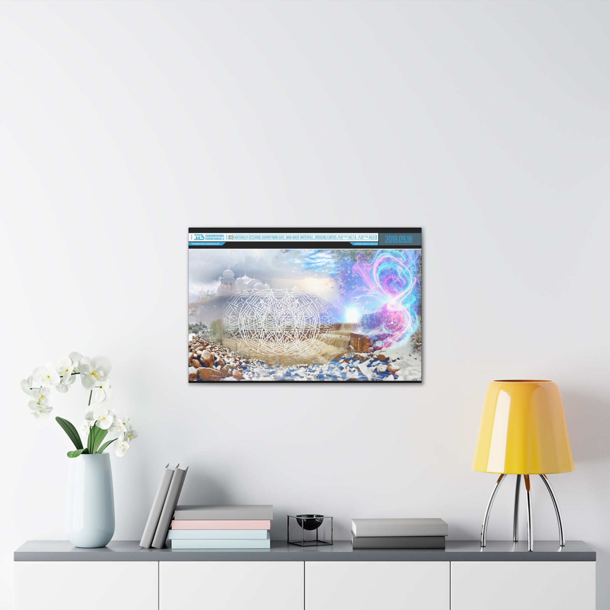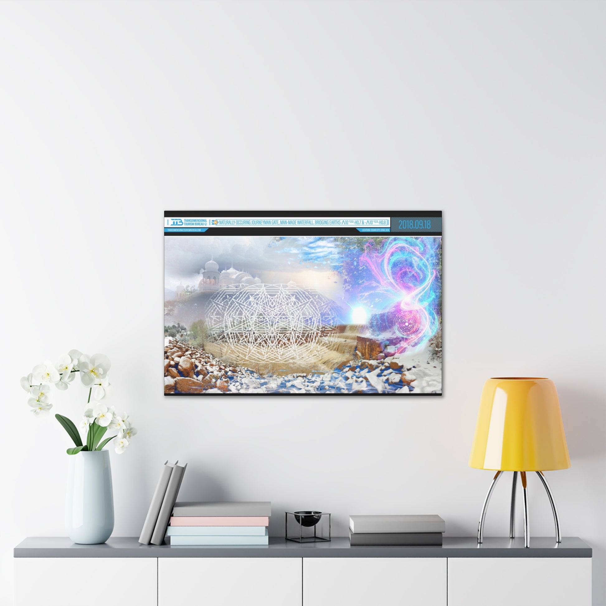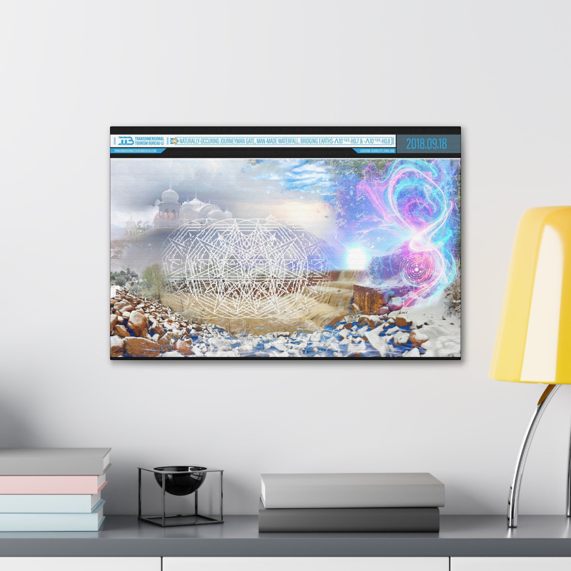 Titled Naturally-Occurring Journeyman Gate, Man-Made Waterfall: Bridging Earths-Λ10-¹²²-H0.7 & -Λ10-¹²²-H0.8, this piece is a masterful photomontage that fuses the tactile poetry of Utah's arid landscapes with the ethereal mathematics of multiversal entanglement. Part of a curated series of print-on-demand canvases from Journey Gift Shop, it's perfectly immersive. This artwork is a portal in pigment, inviting viewers to step through the veil of dimensions with the ease of a summer hike.